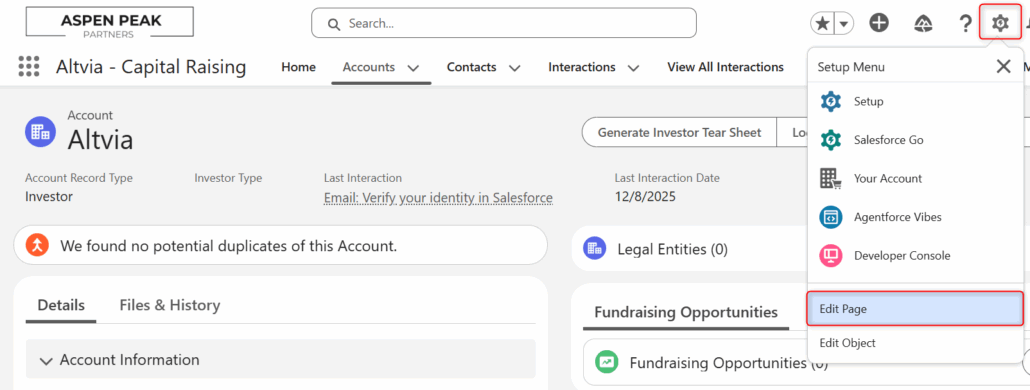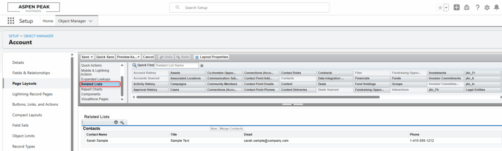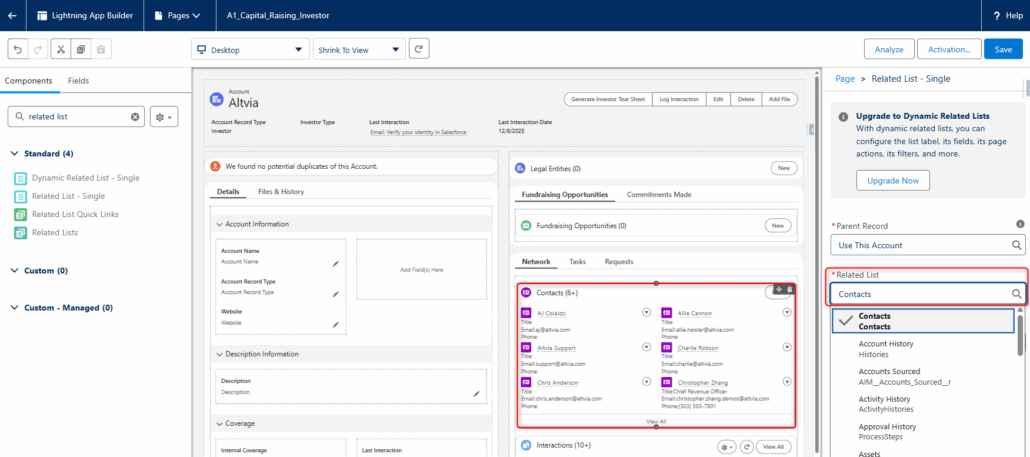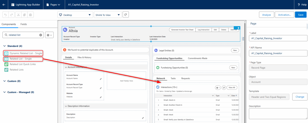 Related Lists are one of the most powerful features in the CRM. They give users quick visibility into connected records—such as Contacts linked to an Account, or Fundraising Opportunities tied to an Entity—without having to run a separate search. To make them available to your users, you’ll need to configure both the Page Layout and the Lightning Record Page.