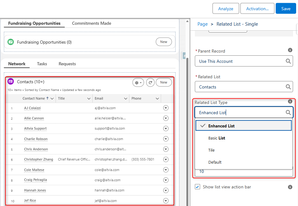 - In the palette, drag the desired Related List (e.g., Contacts, Fundraising Opportunities) onto the layout.