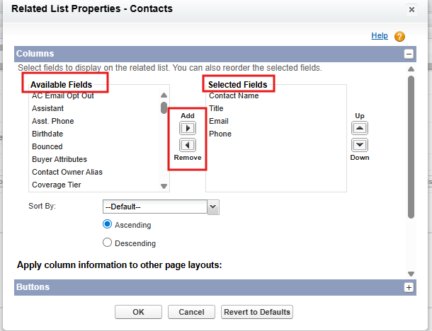 - Move any of the fields that you want to see in the related list from the ‘Available Fields’ box to the ‘Selected Fields’ box using the add and remove arrows.