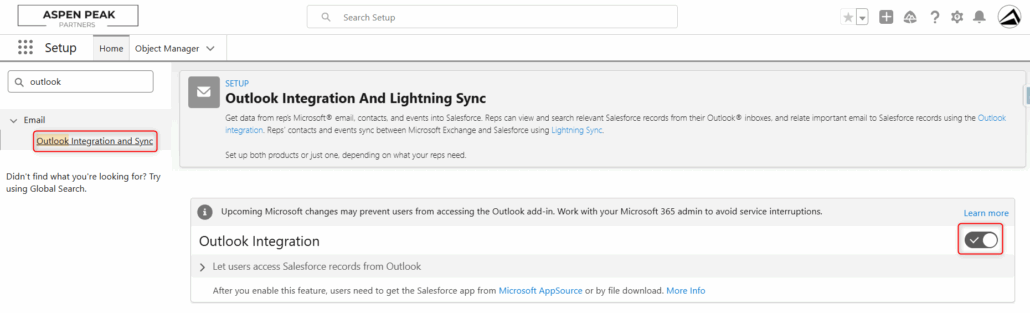 - The Outlook Integration setting must be enabled within your Salesforce org before using the Outlook add-in. If it has not been enabled yet, contact Altvia Support or have a full Salesforce licensed Admin user go to ‘Outlook Integration and Sync’ and enable ‘Outlook Integration’.