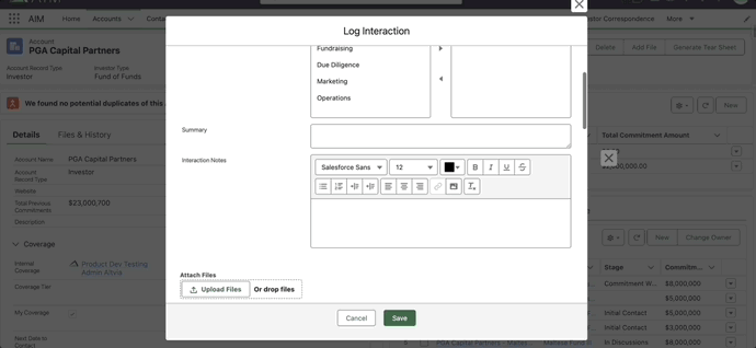 Now, you can upload supporting documents directly during the logging process—no extra steps required. The uploaded files are automatically linked to the interaction record, helping you capture a complete and centralized view of every relationship. This enhancement empowers your team to: