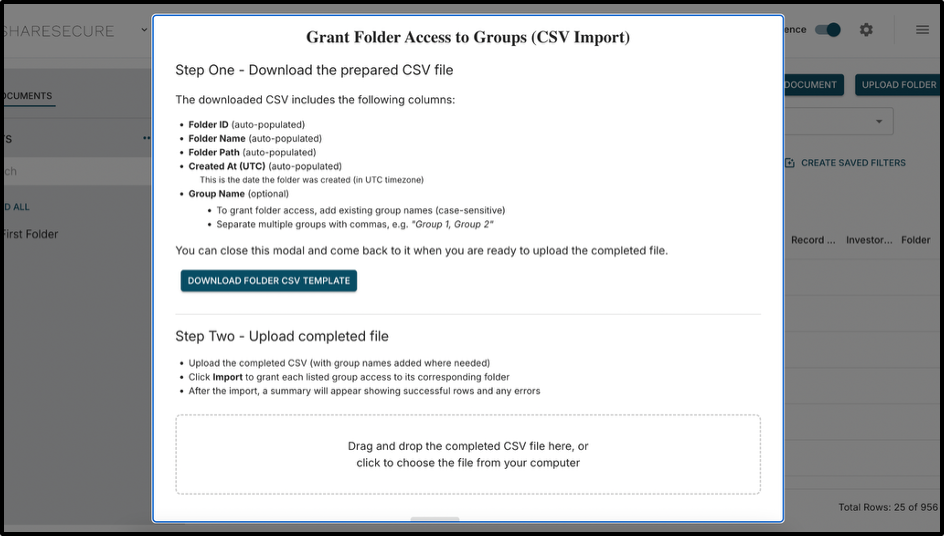 Admins can now grant folder access to groups in bulk using a simple CSV import. Look for the “Grant Folder Access to Groups (CSV Import)” within the workspace menu and follow the instructions. It’s a major time-saver when managing access across multiple LPs or teams.